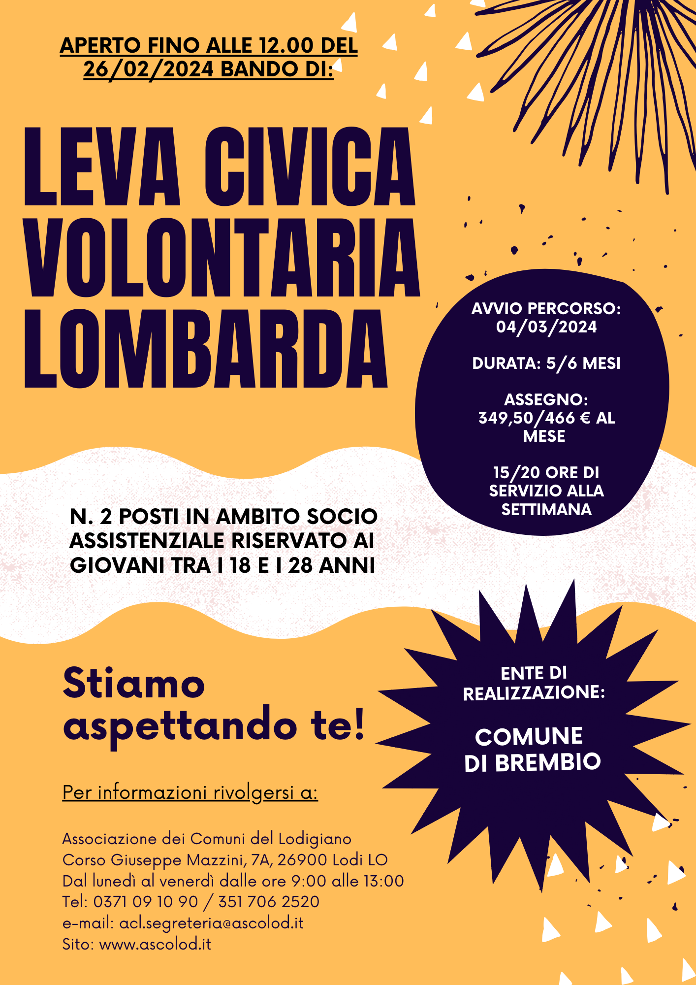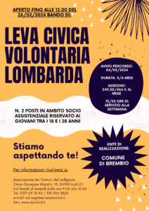 Si pubblica il bando per il progetto denominato “Leva Civica Lombarda Volontaria Comune di Brembio/2024.3”.