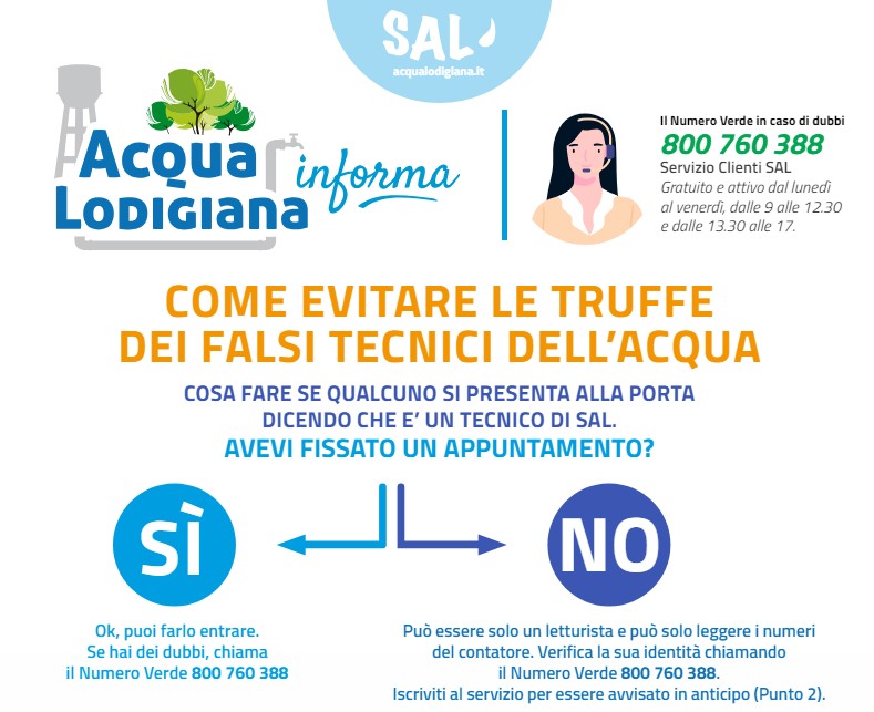Si riportano dal sito aziendale di SAL srl Società Acqua Lodigiana alcune raccomandazioni utili per evitare truffe da falsi tecnici.