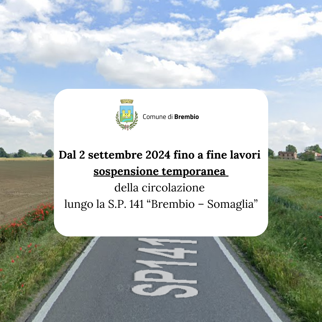 In ottemperanza allโOrdinanza dirigenziale della Provincia di Lodi, comunichiamo la sospensione temporanea della circolazione lungo la S.P. 141 โBrembio – Somagliaโ, dal km 4+400 al km 7+230 (tratto tra Brembio e Zorlesco) a partire dal 2 settembre e fino al termine dei lavori.