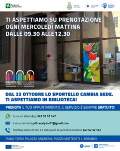 Dal 22 ottobre lo sportello si sposta dalla Sala Civica alla Biblioteca di Brembio 📚