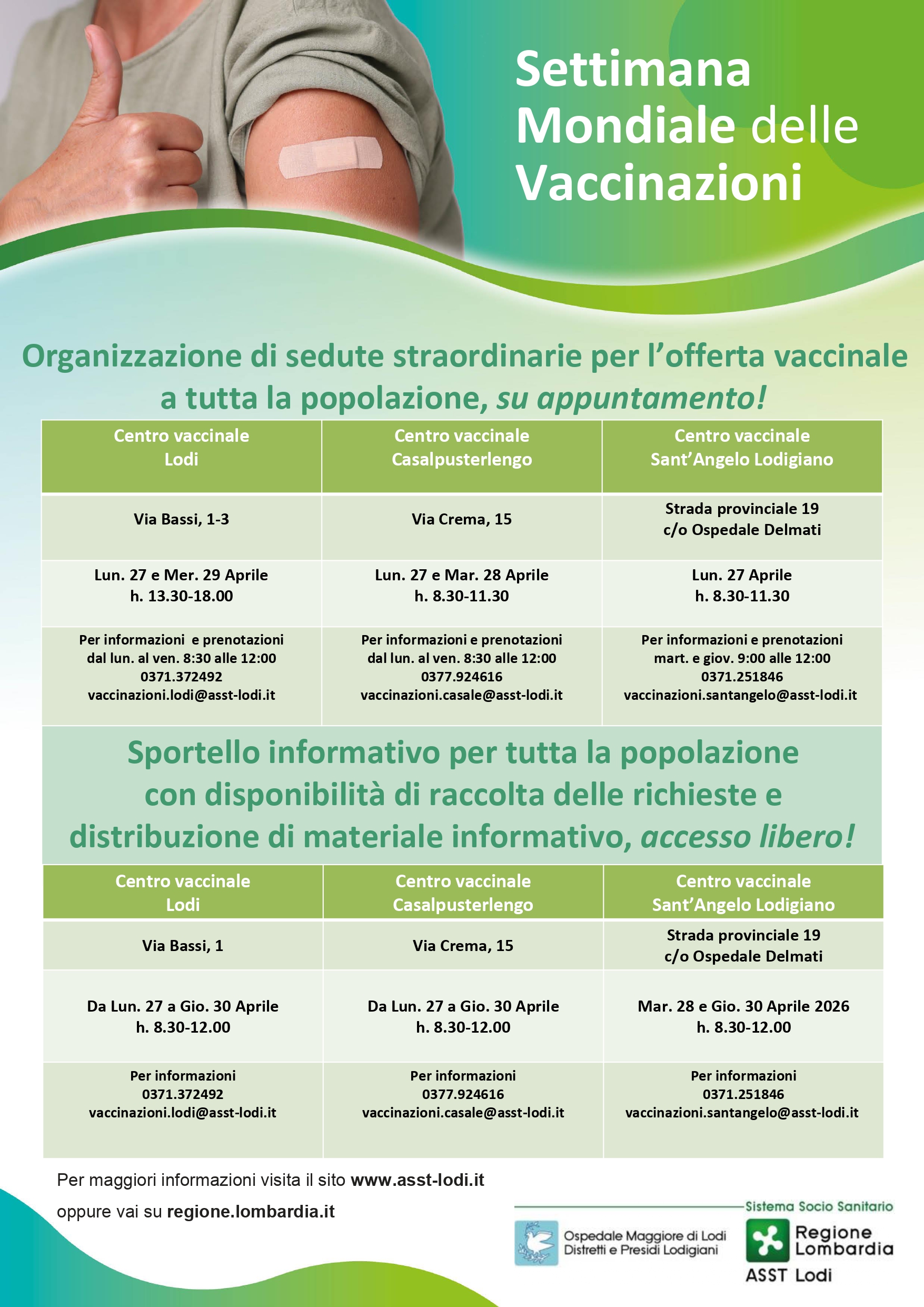 In occasione della Settimana Mondiale delle Vaccinazioni, l’ASST di Lodi ha organizzato sedute straordinarie gratuite aperte a tutta la popolazione.