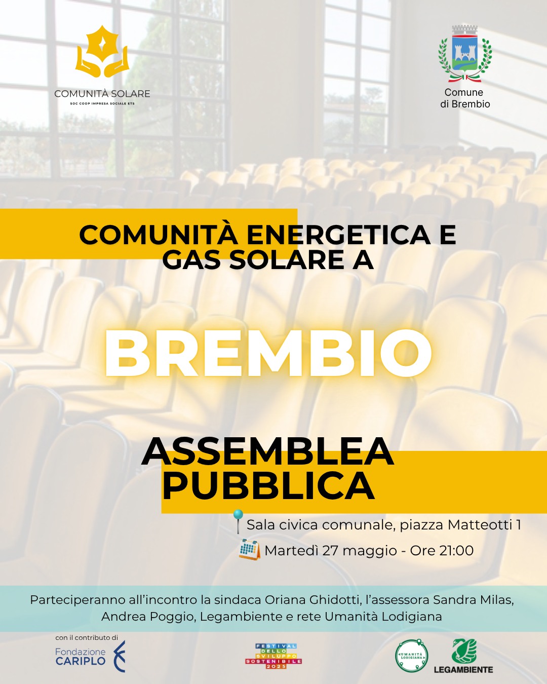 Il Comune di Brembio invita tutta la cittadinanza a partecipare all’assemblea pubblica per conoscere il progetto Comunità Solare, promosso da Legambiente.